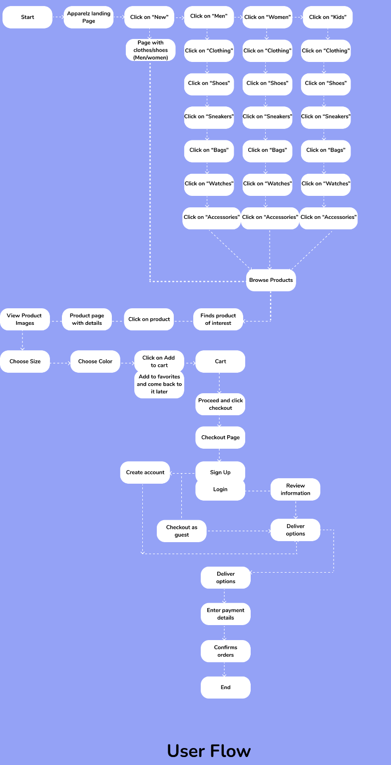 I started by making a thorough user flow after finishing the task flow. This essentially shows the different routes a user can take to finish a task. By creating this flow, I was able to analyse the possibilities available to users of the Apparelz website and to think from their point of view.